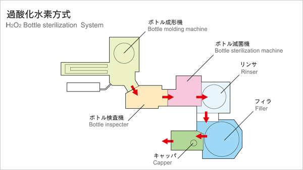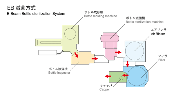 ボトル滅菌には、主として電子線(Electron Beam)のエネルギーを利用してPETボトルを滅菌するEBボトル滅菌システムと、過酸化水素ボトル滅菌システムがあります。