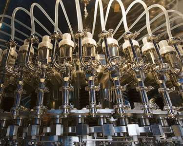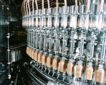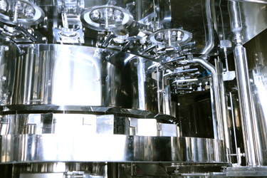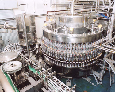 炭酸飲料や果汁入り飲料、無炭酸飲料などの充填を行うシステムです。毎分1,000本のスピードでも高精度に、しかも安定して充填が行える信頼性の高いシステムです。無炭酸飲料との兼用もできるタイプや缶に充填するシステムも製作しています。