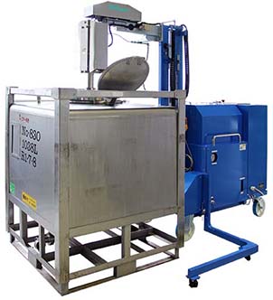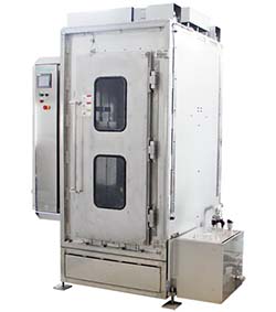 コンテナ内面の洗浄を行います。垂直と水平に回転する3次元洗浄ノズルにより、ムラのない洗浄を実現しています。コンテナを洗浄部に自動搬送するシステムや外面洗浄が行える機種も製作しています。