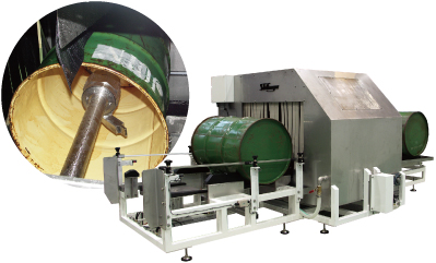 ドラム缶の内面を3次元洗浄ノズルで高圧水洗浄、外面を低圧水シャワーで洗浄します。