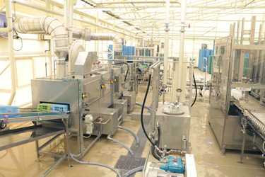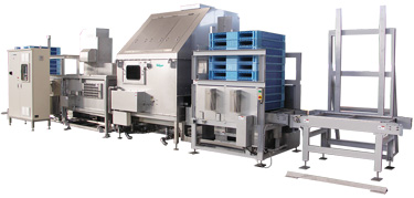 段積みされたケースを1段づつバラしてケースウォシャに供給し、洗浄とラベル剥離、水切りを行った後、異物の有無とケース方向を検査して段積みするシステムです。