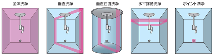 - 垂直回転と水平回転が独立した3次元ノズルにより、全体洗浄のほか洗浄パターンを自在に設定可能で、タンク形状や汚れの状態に最適な洗浄が行えます。