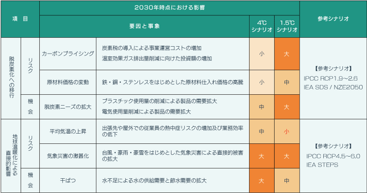 気候変動によるリスク及び機会の特定にあたり、2050年のカーボンニュートラルと整合する2030年目標が日本において設定されていることから、2030年時点を想定したシナリオ分析を行いました。分析では、IPCC(気候変動に関する政府間パネル)やIEA(国際エネルギー機関)が公表するシナリオを用いて、産業革命期頃の世界平均気温と比較して2100年頃までに気温が4℃上昇するとする4℃シナリオと、カーボンニュートラルへの取り組みにより気温上昇が2℃以下に抑制される1.5℃シナリオの2つのシナリオで定量的・定性的な分析を行いました。 4℃シナリオにおいては、台風や豪雨、豪雪などの異常気象の激甚化によって当社の生産拠点や物流への直接的な影響を想定しております。そのうち、国土交通省が公表する治水経済調査マニュアルを参考に、洪水被害と高潮被害については発災時の被害予測を定量的に評価・把握しています。また、主に国外にて拡大する干ばつ被害による影響から、水の供給需要と節水需要が拡大することを予測しており、自社製品の環境性能向上が世界的な気候変動への適応及び緩和に資するものと認識し、社会貢献の可能性を確認しています。対して1.5℃シナリオにおいては、カーボンプライシング制度の導入が当社にも直接的な影響を及ぼすものと想定しています。また、定量的な分析では比較的軽微な影響として試算したものの、製品の原材料である鉄・銅・アルミニウムをはじめとした資材価格が高騰する可能性も認識しています。一方で、製品に対する脱炭素化需要が拡大することを想定しており、特に販売製品の省資源・省エネルギー性能の向上や資材調達段階を含むライフサイクル全体での環境負荷の低減、再生材の利活用を見据えた技術的対応の推進が、新たな機会獲得及び事業拡大に資するものと認識しています。
