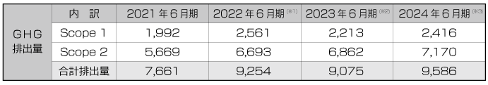※1 Scope3の算定は検討中であります。2022年6月期は関係会社との合併により、 Scope1が422t-CO2、Scope2が870t-CO2増加しました。 ※2 2023年6月期は、新工場(能美ハイテクプラント)の操業開始などにより、 Scope2が169t-CO2増加しました。 ※3 売上高の増大に伴い、新工場(能美ハイテクプラント)を含む各工場の稼働率が上がり、 Scope1・2ともに増加しました。