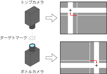 実際の動作としては、まず同一ターゲットマークにトップカメラとボトムカメラで同時にパターンマッチングを行います。それによって、それぞれのカメラのターゲットマークからの位置差分を検出します。この差分を実装時の位置決めにフィードバックすることでカメラ位置の移動分が吸収されます。